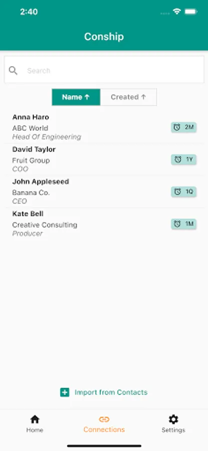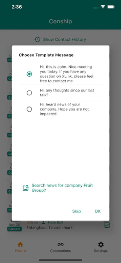 Conship is a personal CRM app. It import connections from your Contacts and alert you when it's time. You can define message templates to be used when engaging with connections.