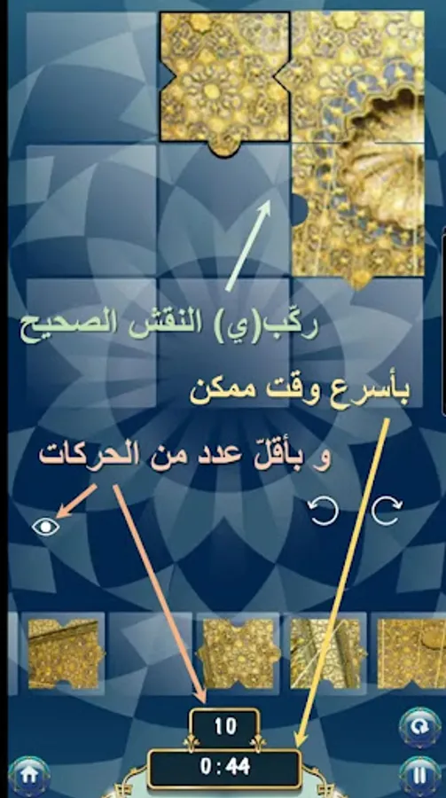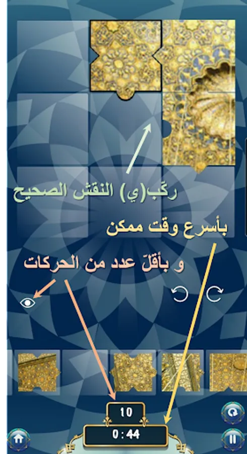 يتوجب عليك أن تتذكر(ي) أشكال النقوش المختلفة، لإعادة رسمها قطعة قطعة ... ولكن هذا لا يكفي : لا بدّ لذاكرتك أن تكون قويّة و أسلوبك مبدعا لكي تتمكن(ي) من النجاح في أسرع وقت وبأفضل طريقة ممكنة (وبأقلّ عدد من النظرات إلى الرسم الكامل)... لا بد من الذاكرة والسرعة والذكاء والإبداع والمثابرة
