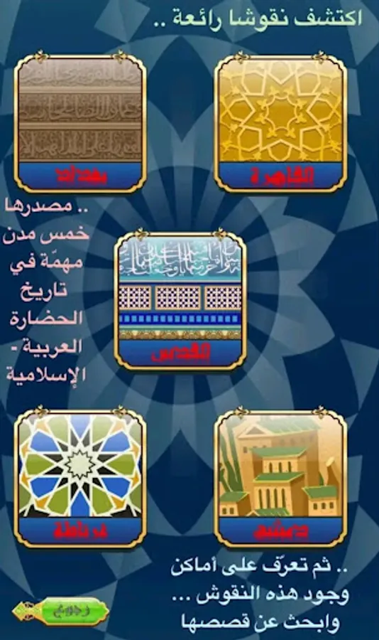 نقوش مكسّرة هي لعبة تمزج اختبار ذاكرتك وبراعتك ، مع استكشاف جوانب من فنون الحضارة العربية - الإسلامية عبر السياحة في بعض مدنها.. استمتع(ي) بالتحدّي، حسّن(ي) مهاراتك الفكرية، وتعلّم(ي) عن إبداعات حضاريّة مهمّة تشهد على تاريخ غنيّ وحافل