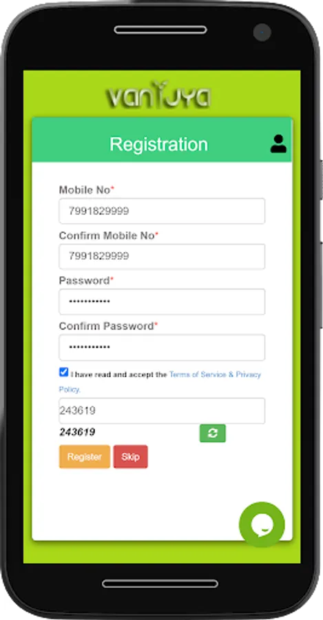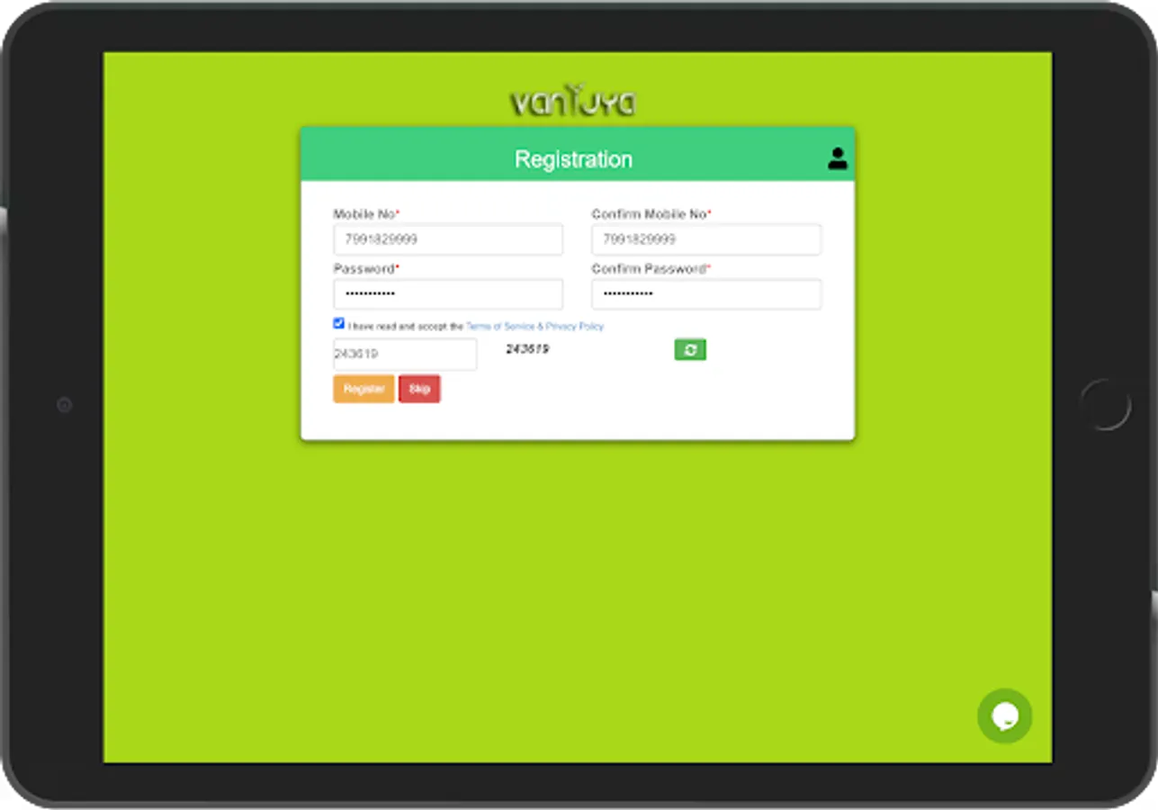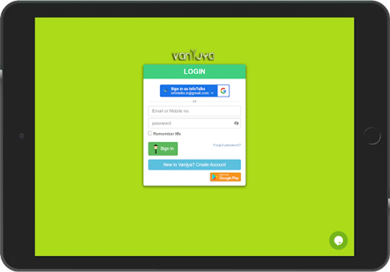 Note: You must be running 5.0 Android OS or later. You can use the same login through a web browser (www.vanijya.biz), preferably Chrome or Firefox.
