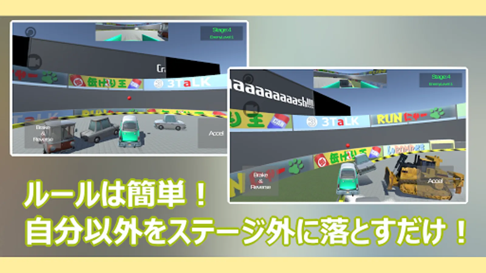 It is like a fighting sport using a car like hitting the outside of the stage while colliding with other cars.
