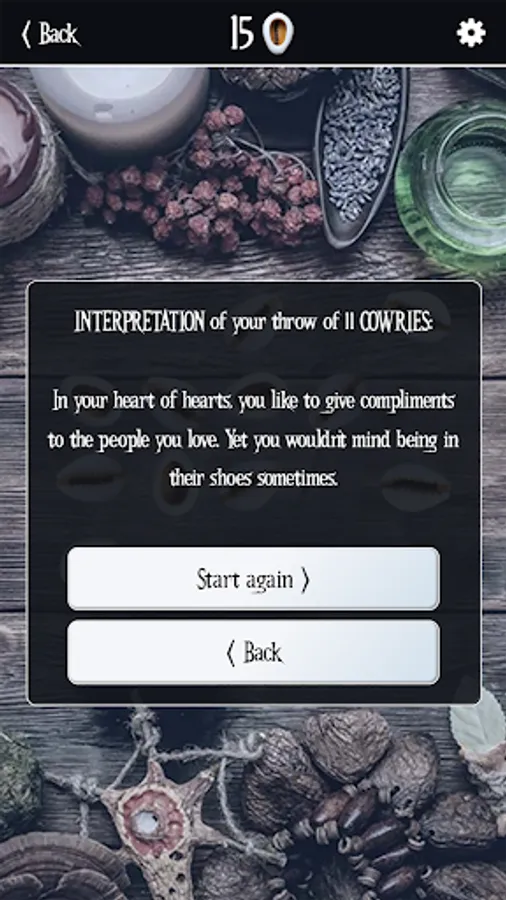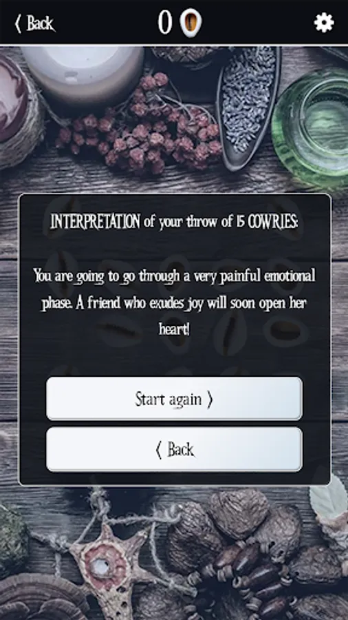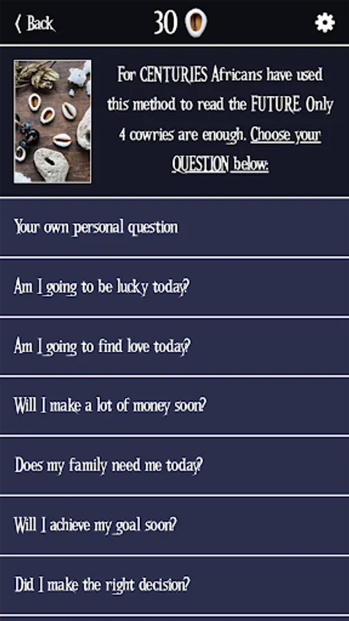 This free application will allow you to get answers about your future with the help of cowries. This ancestral method of fortune telling has been used for centuries in West Africa. For the first time it is adapted in a functional way for your phone in order to provide the whole world with a really efficient clairvoyance service.
