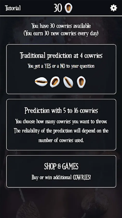 The application is voluntarily free. You will receive a small number of cowries every day allowing you to get important and crucial answers for you, and personalized and reliable predictions. You can get more cowries by playing little games, completing missions or buying packs. Advertising helps us to finance the service because we are interested in making sure that our technology benefits as many people as possible and not just a few insiders.
