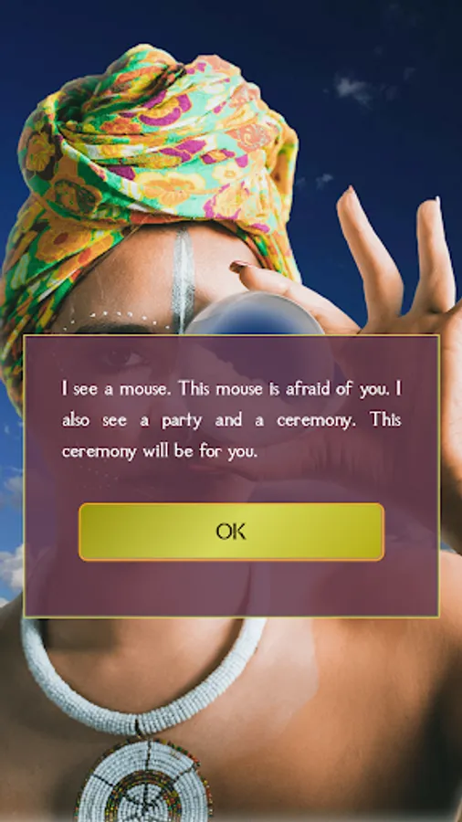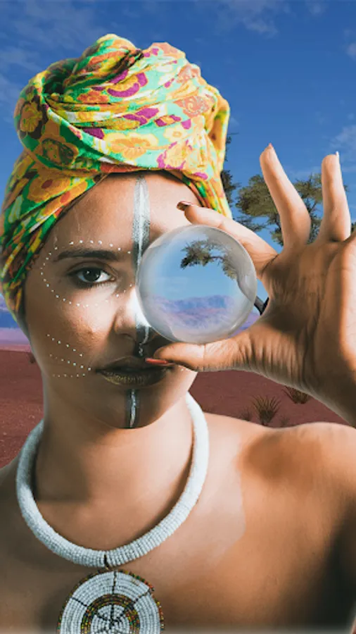 Fatou is a psychic born in Africa. She has the ability to read your future with her crystal ball and her visions. Inspired by the nature of this great continent, Fatou will guide you towards a symbolic understanding of time.