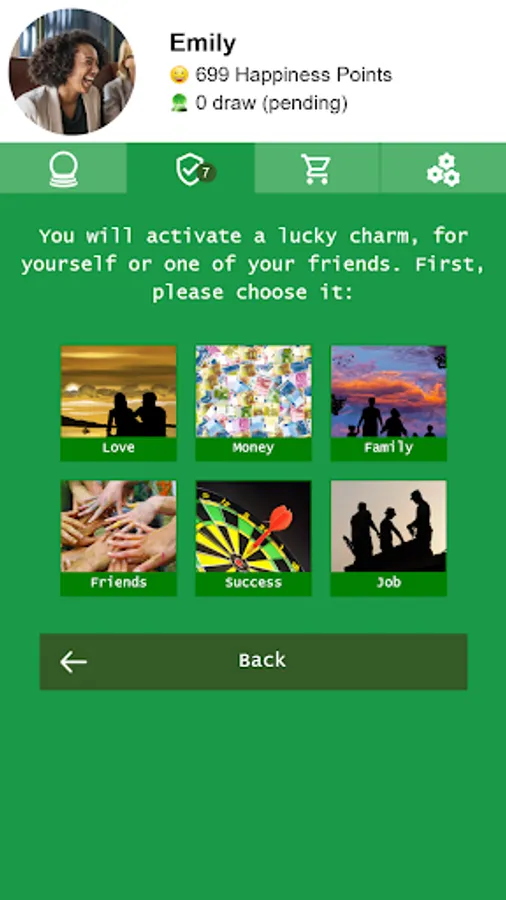 During your first use of this app: You will be asked for a name, a nickname and possibly a profile picture. Your experience with the application will be all the better for it. The application contains two sections: The good-luck ball and the lucky charms.