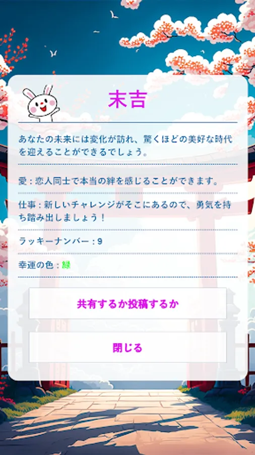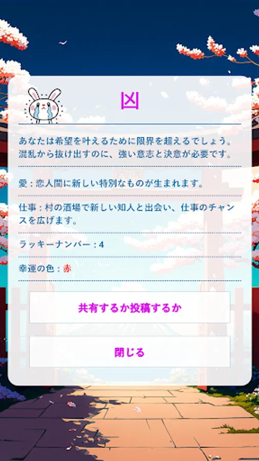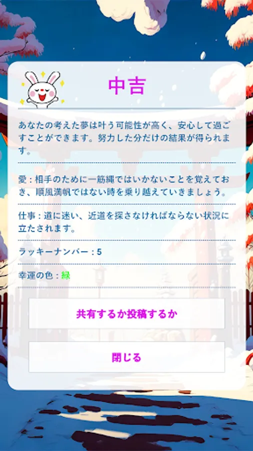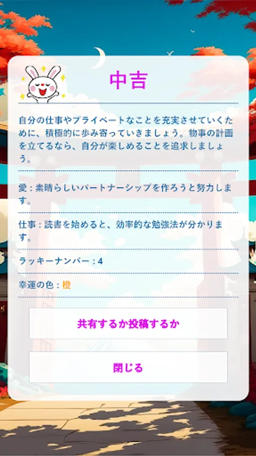 With this app, you can fortune fortunes only once a day. You can also view yesterday's fortune-telling results and share them on social media.