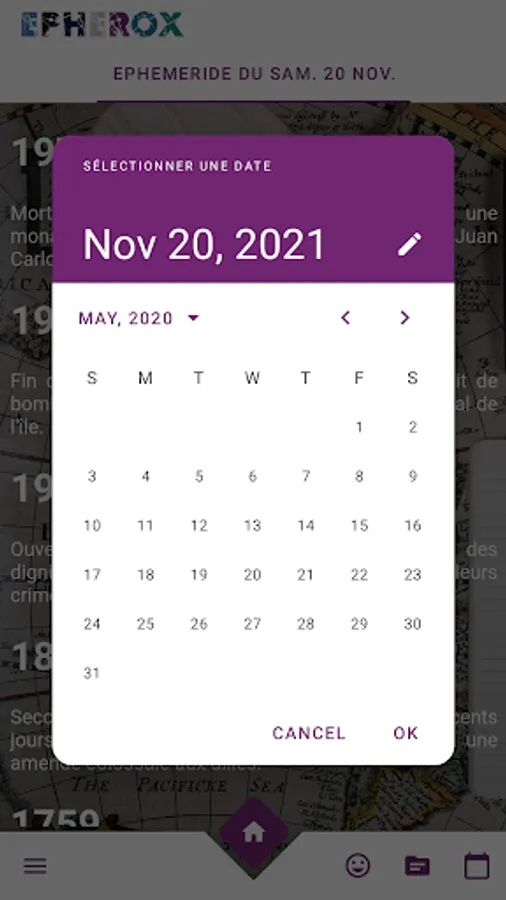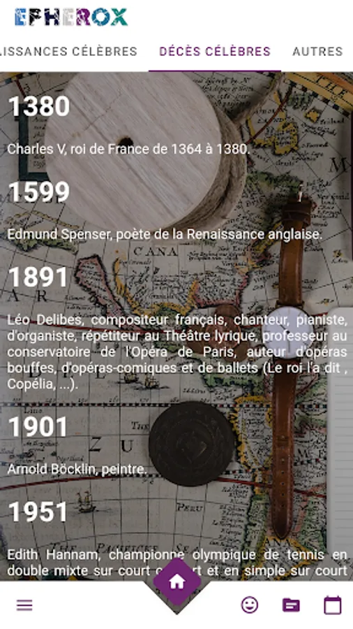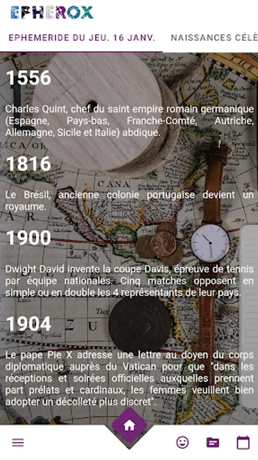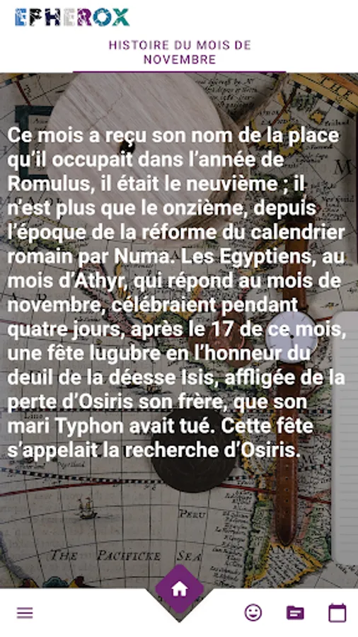 Free ephemeris, find in one place displaying the holidays the events of the day that marked the history of the world, but also several other information such as holidays, relative first names, the sane of the day, national holiday, deaths and birth of fame. Our app adds for you the stories related to the genesis of the name of each month.