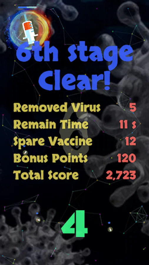 스테이지 단계마다 90초 안에 백신 볼을 만들고 모든 바이러스 볼을 터트리면 다음 스테이지로 이동할 수 있습니다.
