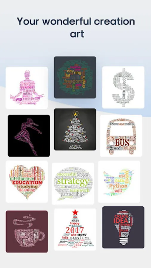 After using this word salad app only for once, you'll definitely love this app & you will surely recommend downloading this Word Art Generator to your friends. Word Art Generator is the number one Word Cloud Generator used in education. Many schools love even it's very helpful to teach students if you are a teacher you should definitely give it a try. Now in a days this word bubble app is used by most people to have a fun for their own happiness. This cricut design app also help you to make beautiful design of the words which matter for you. So why you are waiting for? Just download this world cloud app and start using it.