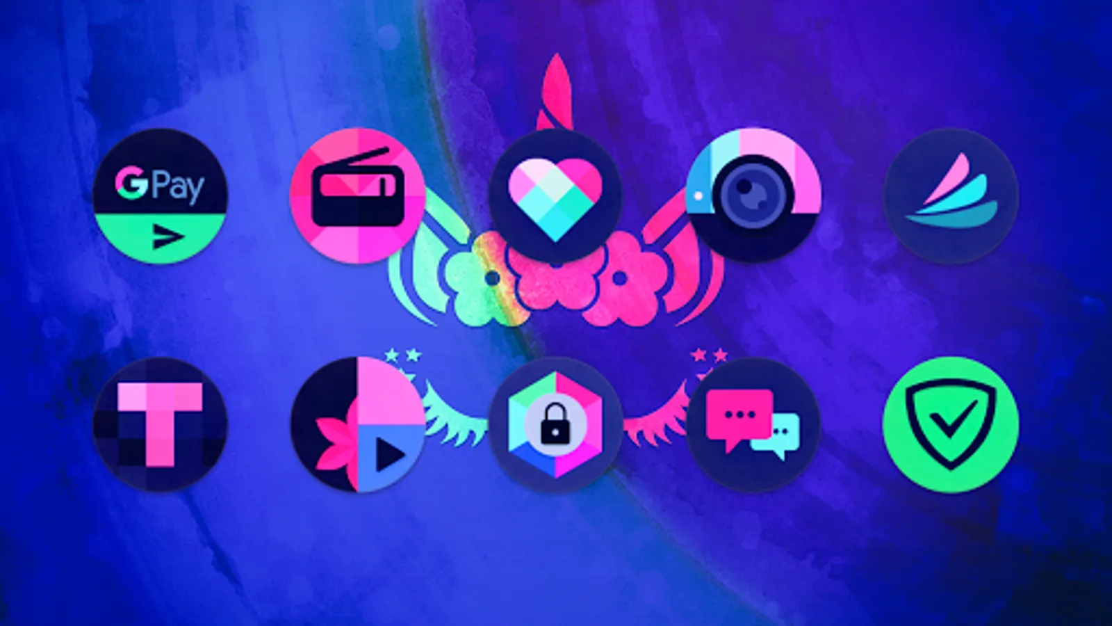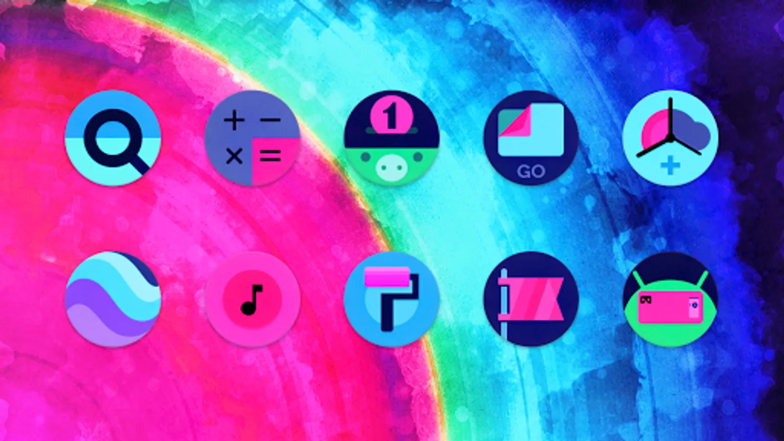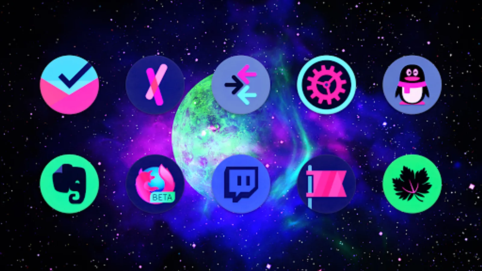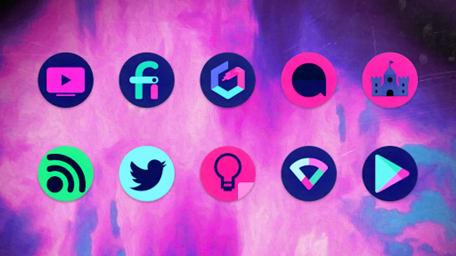 All-new dark style round circle icons, featuring a mix of deep purples, pink, blue and teal colors. Includes exclusive matching wallpaper pack, support for all popular launchers, and more!