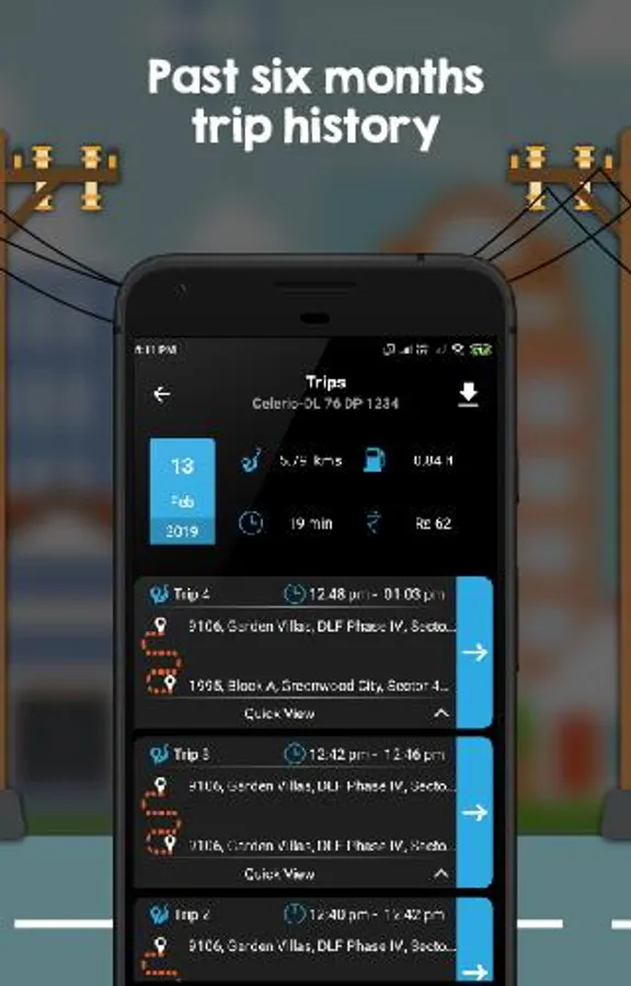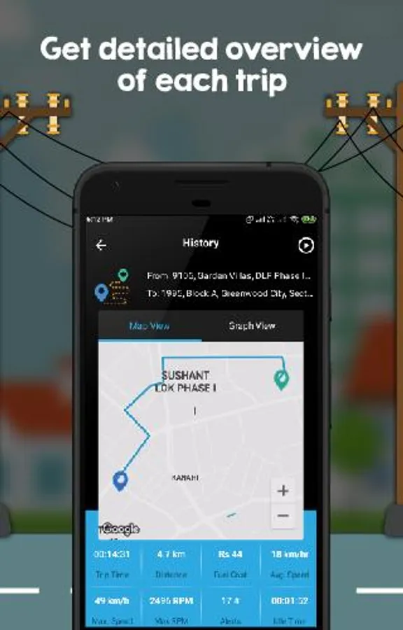 • Trip history – Access all your last 6 months trip data along with route, trip statistics, fuel consumption and also a clean graphical breakdown of your driving performance