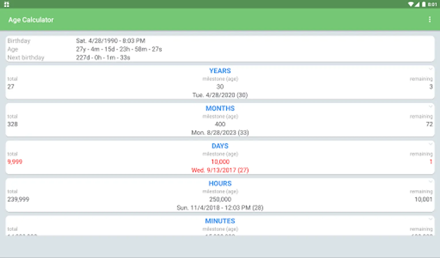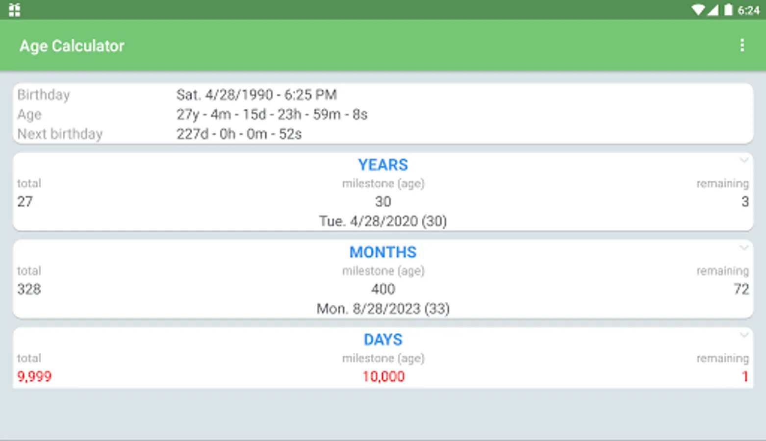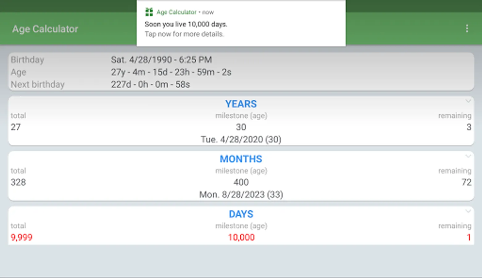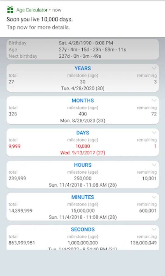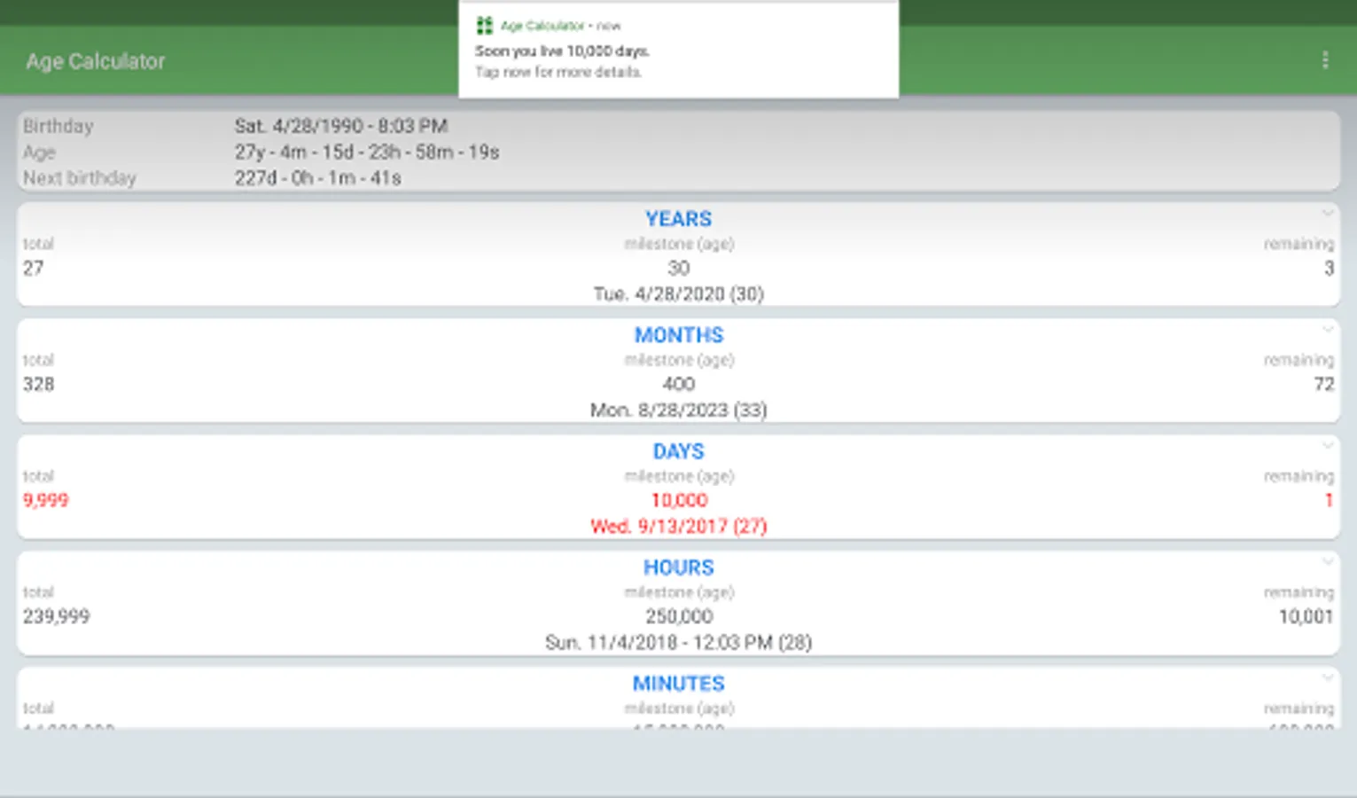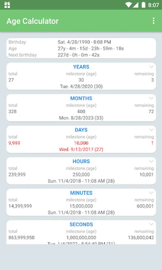 - Realtime remaining until your next birthday in days, hours, minutes and seconds.