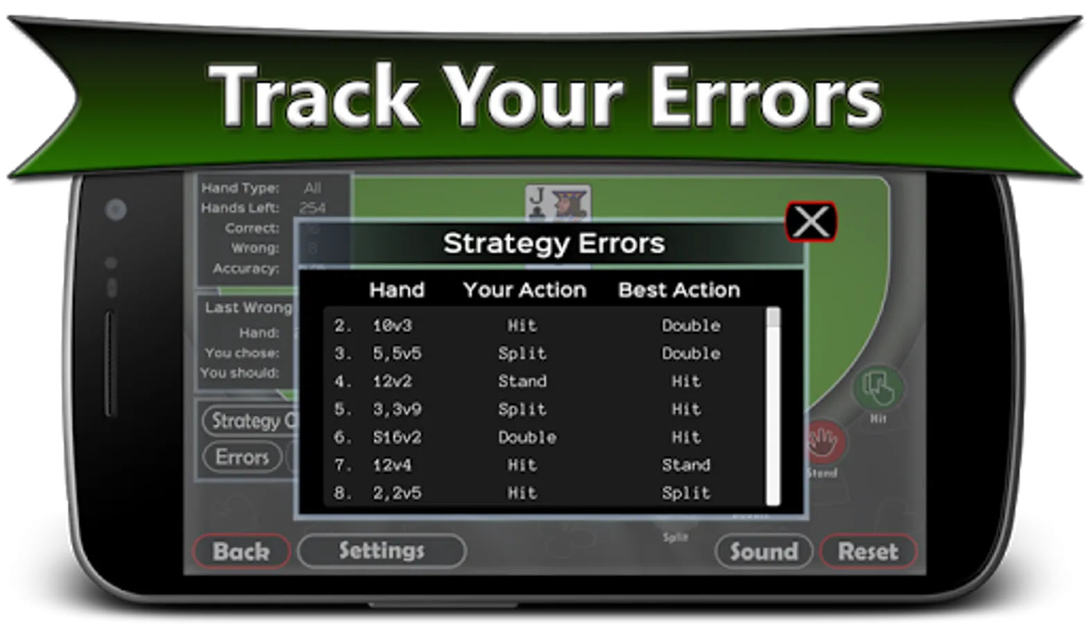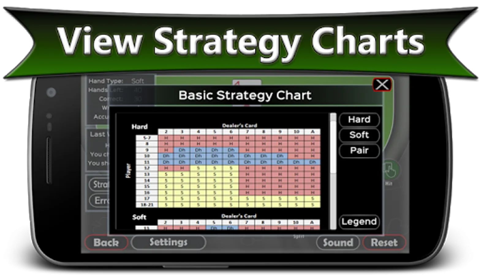 - Completely customizable Basic Strategy charts. (e.g. You can see what happens if you were to split on every pair hand or what would happen if you were to stand on every hand.)