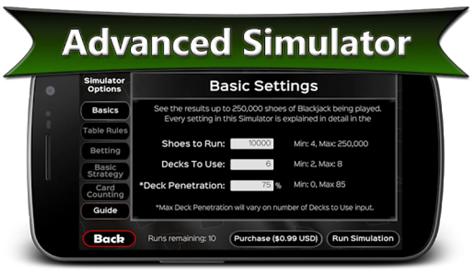 - Adjust how many decks should be used and how far into the decks the Simulator should go before shuffling again.
