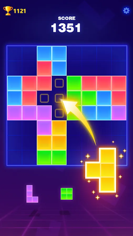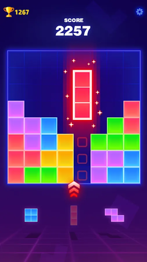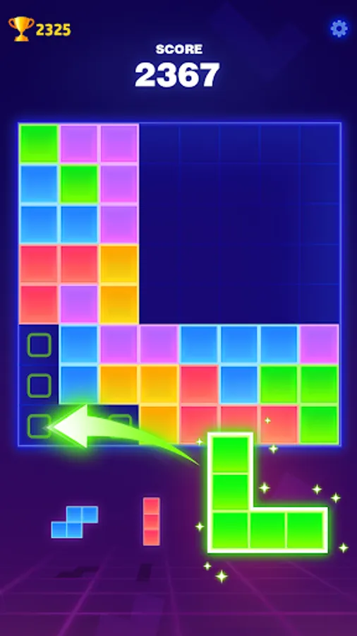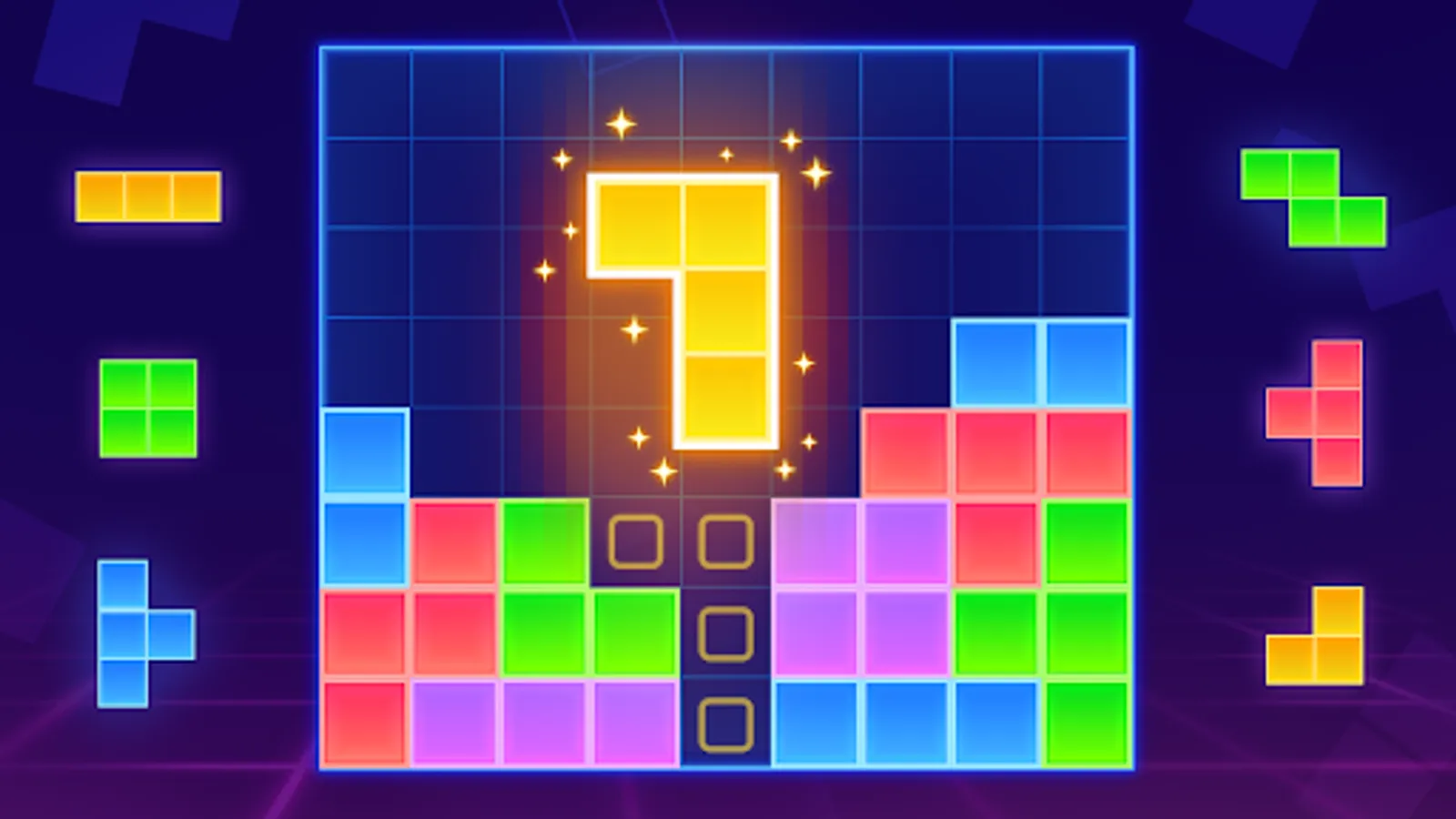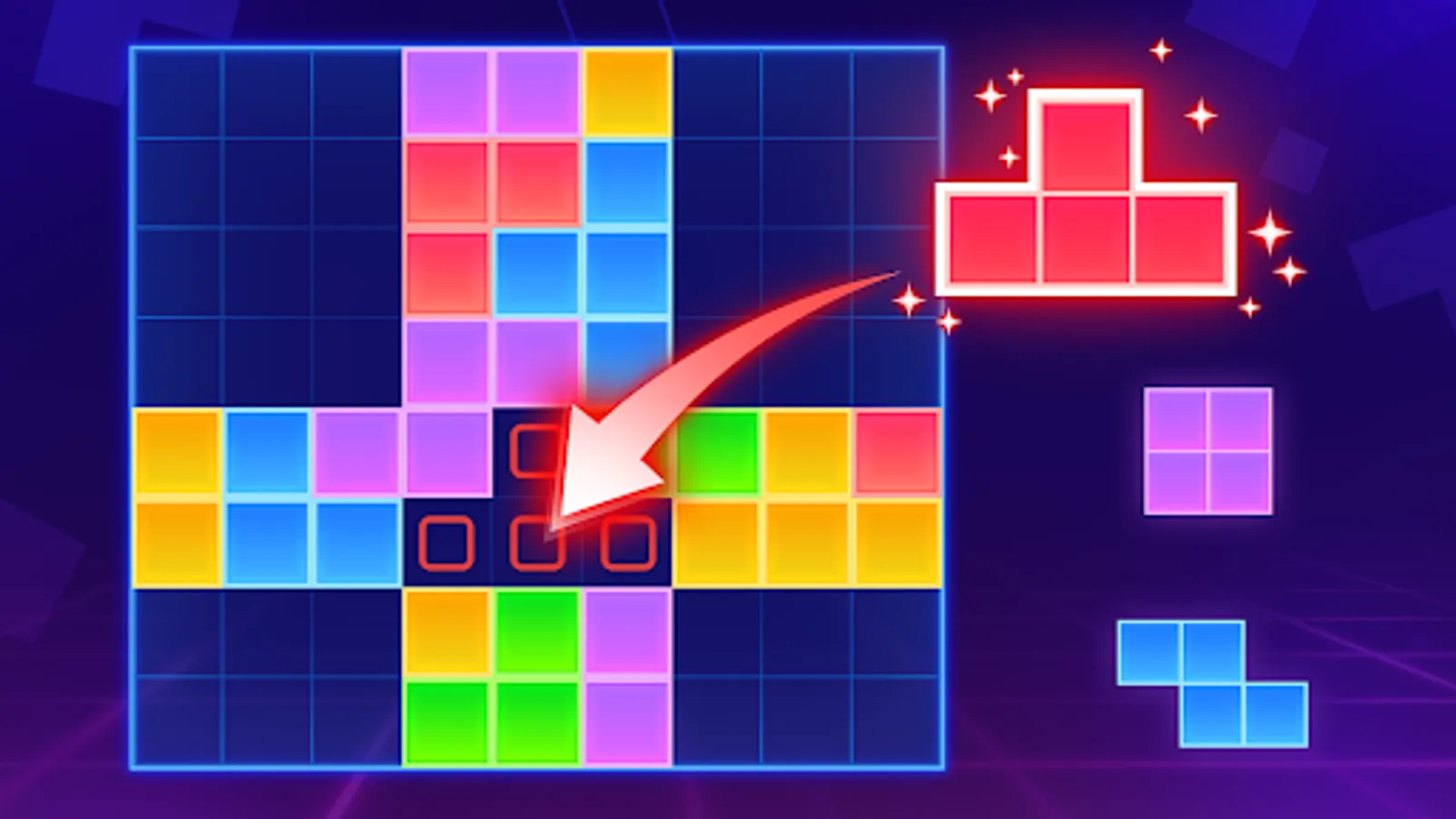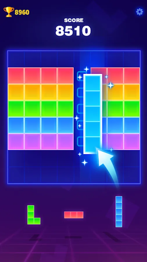 Block Puzzle - A classic block match and elimination game. In the game, we have no time limit, and three types of blocks can be chosen at once. You won't be under the pressure of time or restriction of steps and you can select and place the neon blocks as you want😀.