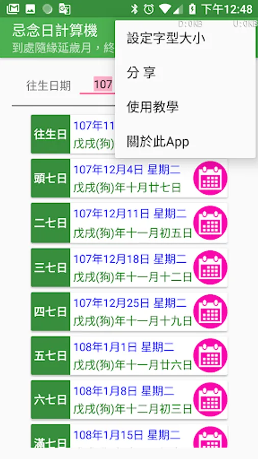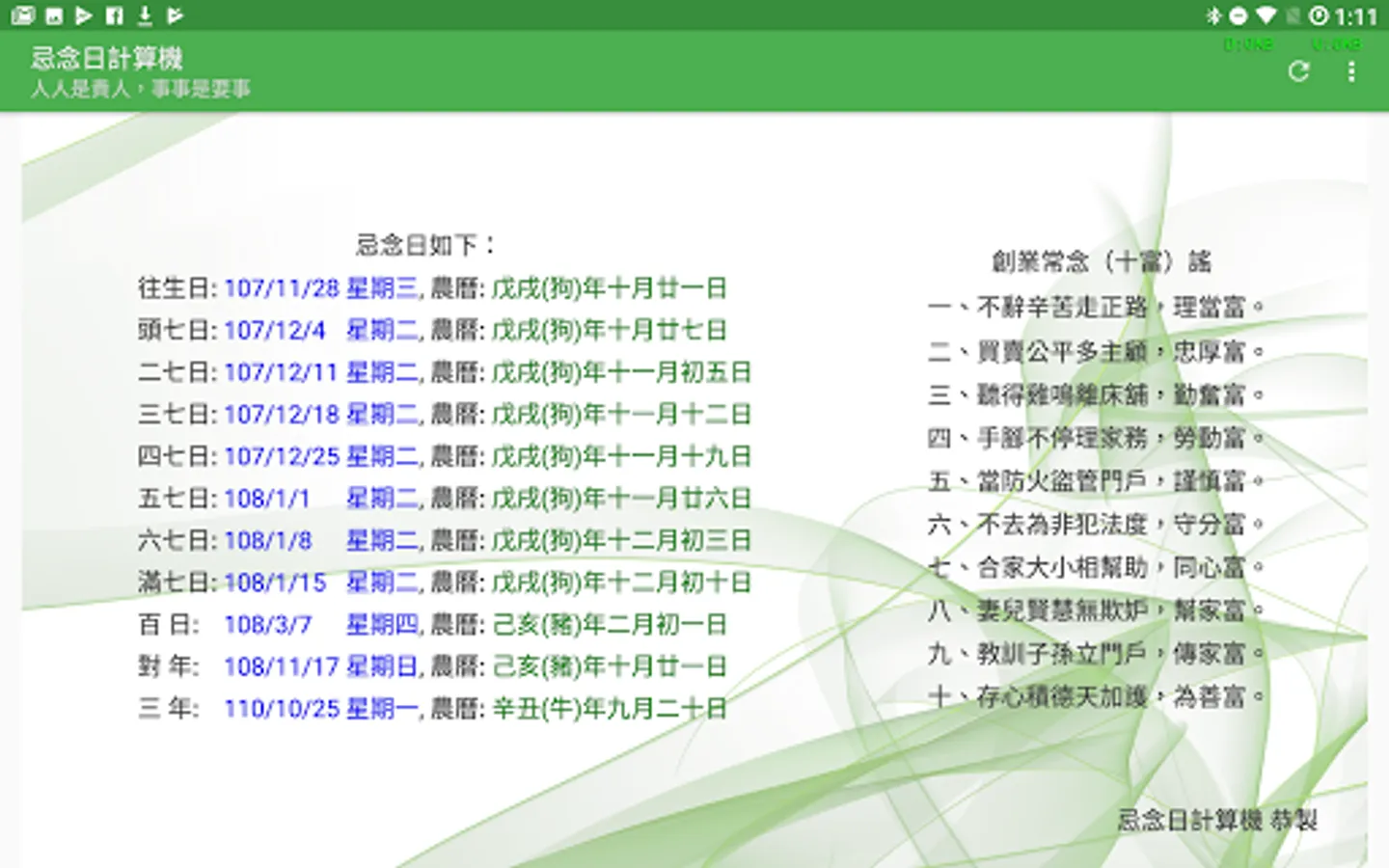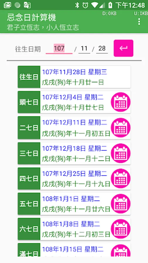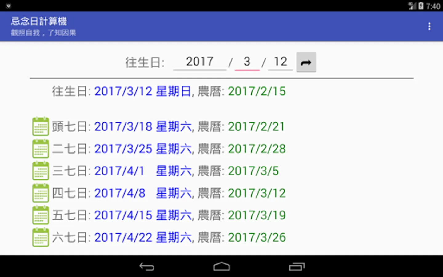 In the traditional Chinese funeral customs, every seven days after the death of a person, they should make merits for the deceased, hoping that this merit will enable the deceased to live a good life. In addition, there are also hundred days, years and three years of worship. These dates are calculated using the traditional Chinese lunar calendar. Modern people do not have the concept of a lunar calendar. It is difficult to calculate these dates. Making a seven hundred-day counter-year date computer is a computer that is based on these dates, as long as you enter the deceased's death date, you can Calculate all the miss days.