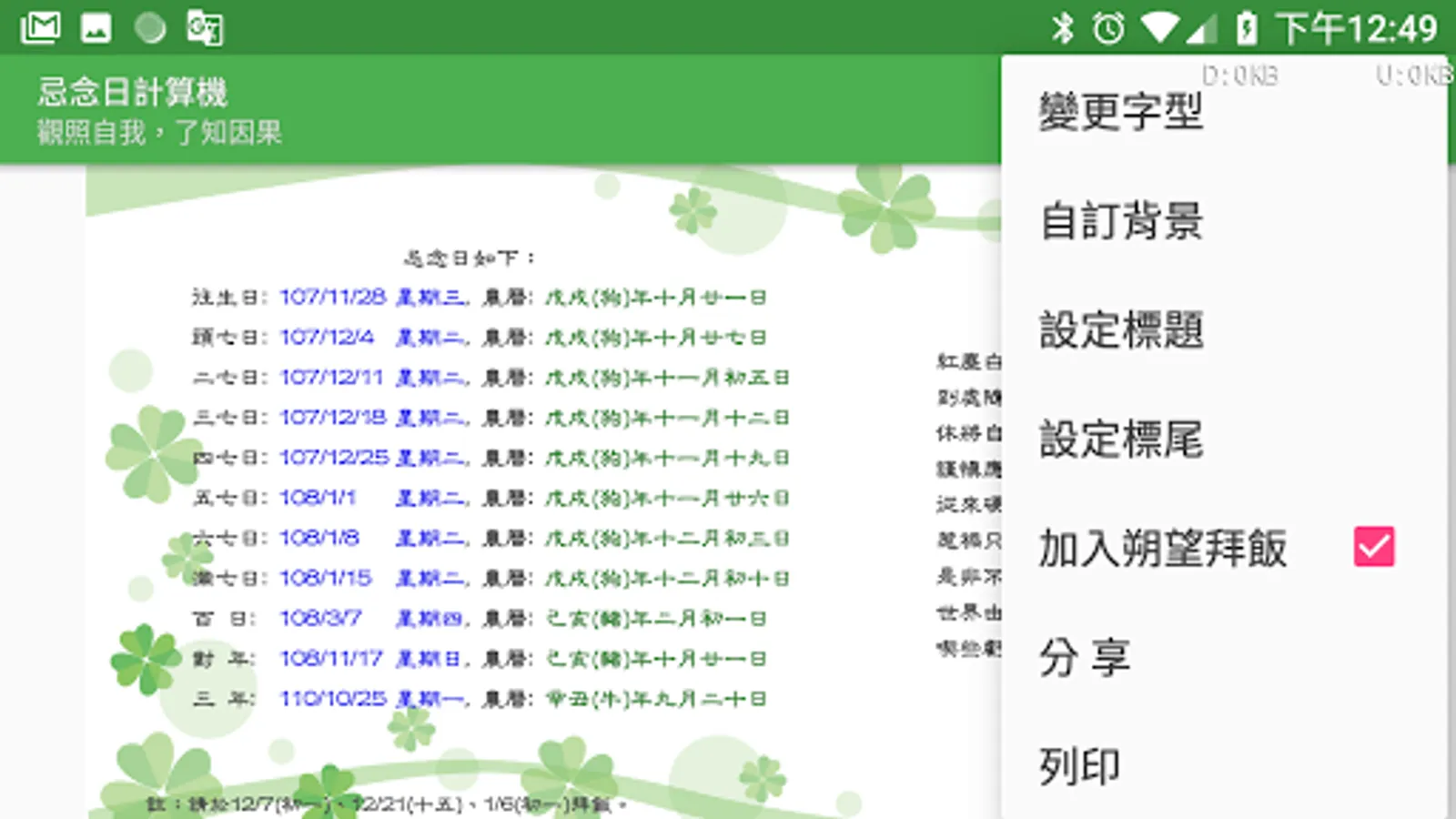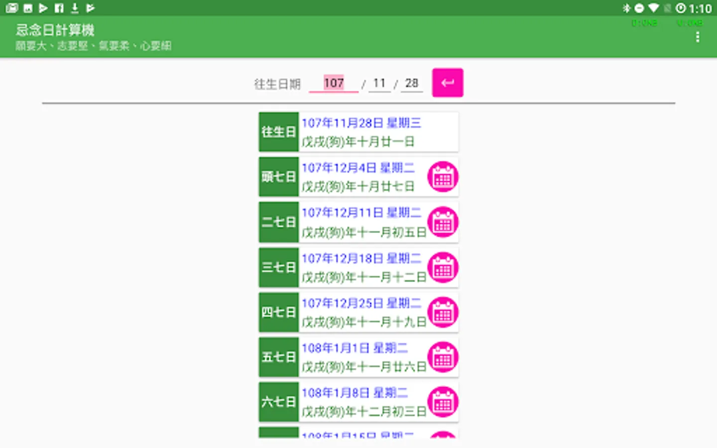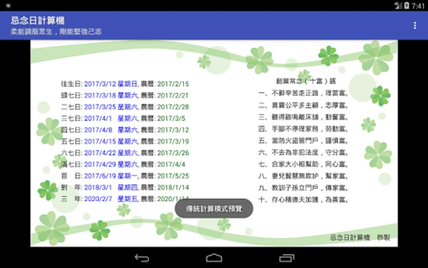 In the traditional Chinese funeral customs, every seven days after the death of a person, they should make merits for the deceased, hoping that this merit will enable the deceased to live a good life. In addition, there are also hundred days, years and three years of worship. These dates are calculated using the traditional Chinese lunar calendar. Modern people do not have the concept of a lunar calendar. It is difficult to calculate these dates. Making a seven hundred-day counter-year date computer is a computer that is based on these dates, as long as you enter the deceased's death date, you can Calculate all the miss days.