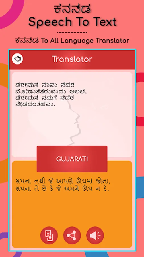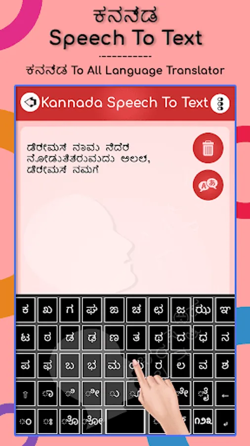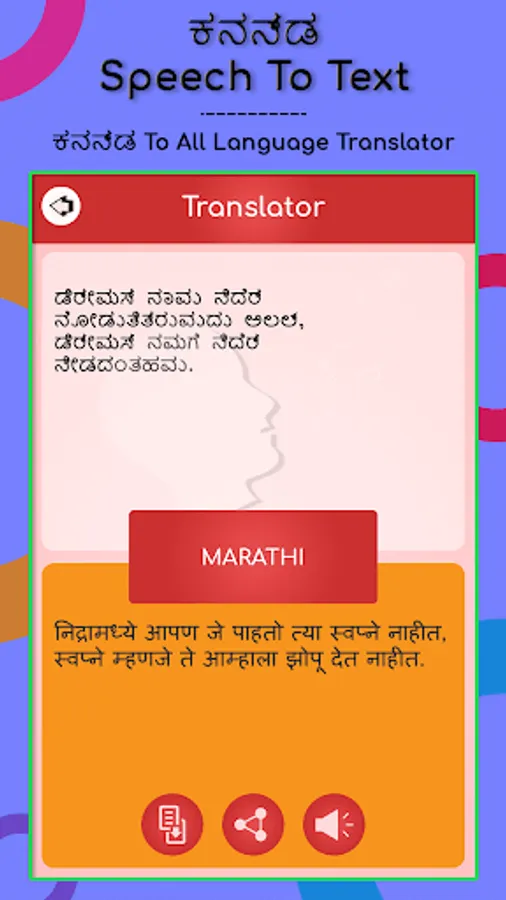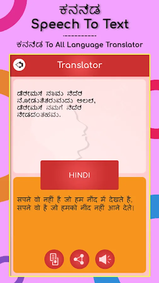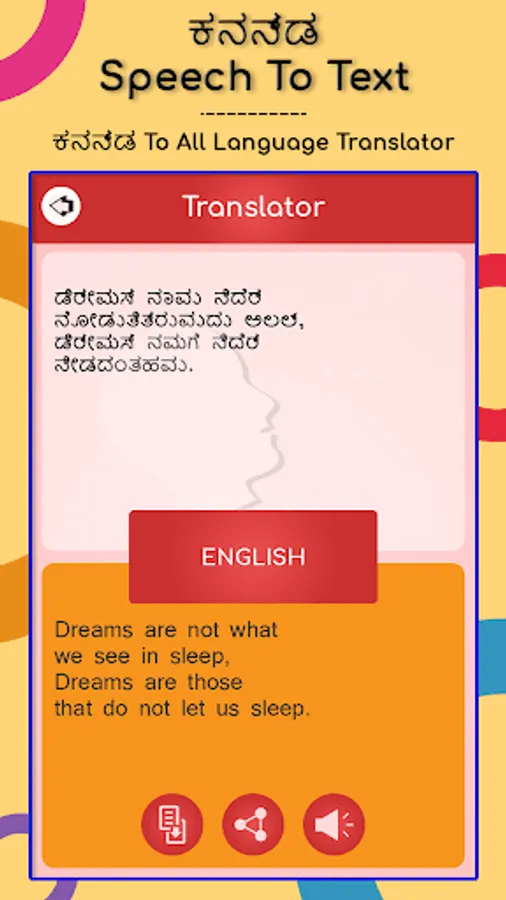 Native Language has its own touch and feels when you send messages in Native, Kannada Language Converter from talking to text will help you to create quick messages in the Kannada Language. This Speak and translate application can be very useful when you want to communicate someone in their native language. Kannada Speech to Text app