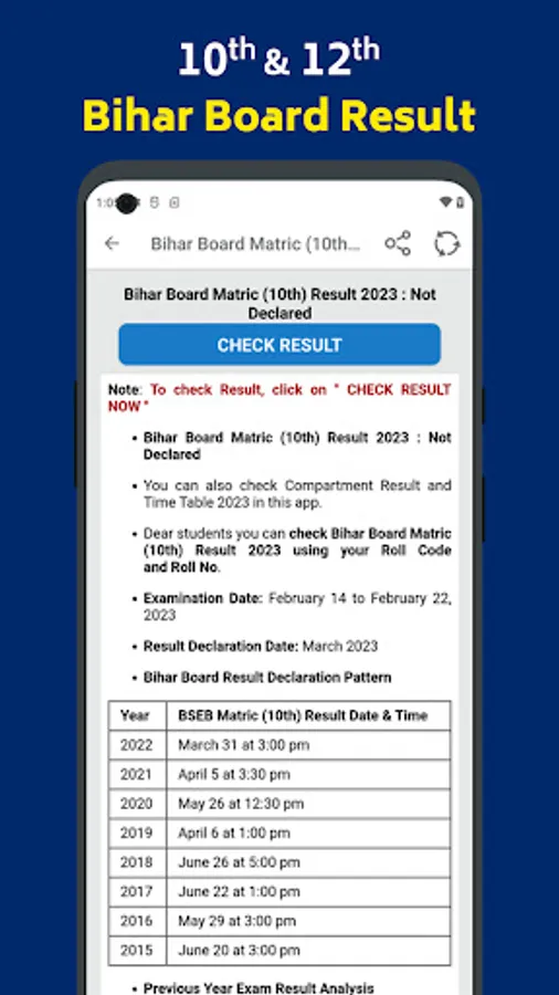 Disclaimer Note: Application is not a official app of Bihar Board Result. This app contains only the Web View interface, in which we display the Website into app. We just Open website interface in the app for easy views So, If any error you face, regarding Bihar Board result Please contact to your respective ones or website Owner. Source of Information: http://bsebresult.online, http://biharboardonline.bihar.gov.in, bihar board Official Website And More Websites. If you any issue please contact us at importanteducationthings@gmail.com, we will solve it asap :) App is not an official app of any Government/Private entity.