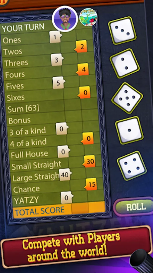 Play with your Facebook friends, against the computer in Offline mode, against your friends in Play with Friends Mode or with millions of Yahtzee players around the world in Online Mode.
