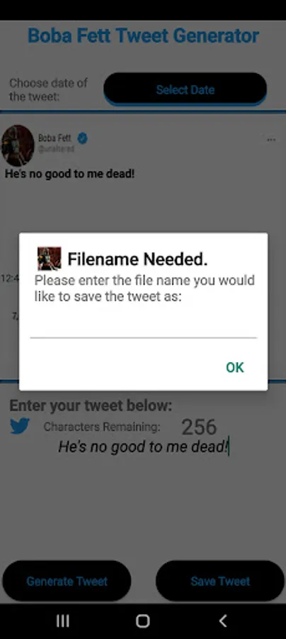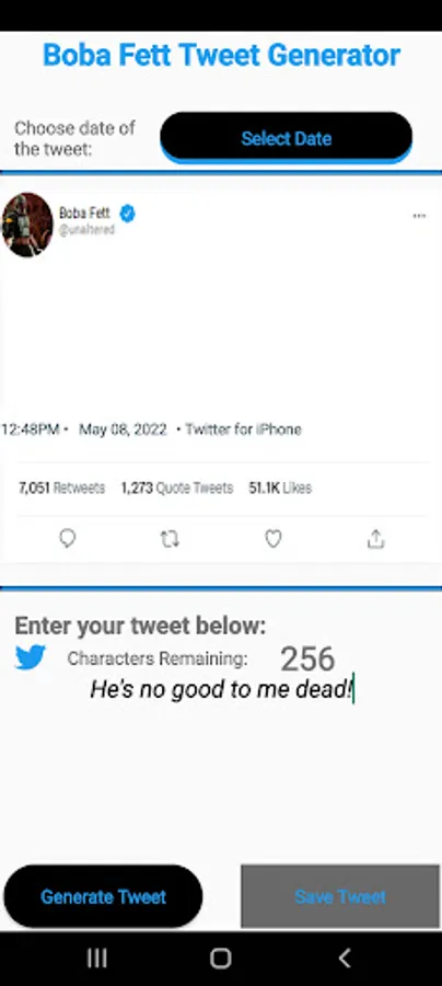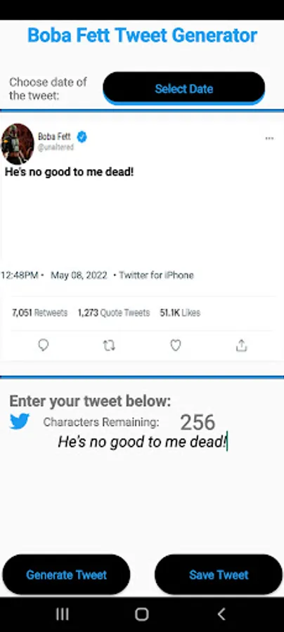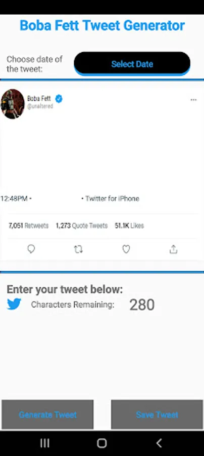 This simple app lets you choose a date and a customized twitter message and creates a meme that looks as though Boba Fett tweeted the message.