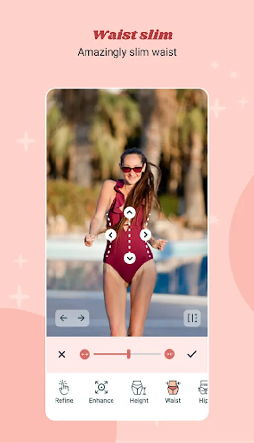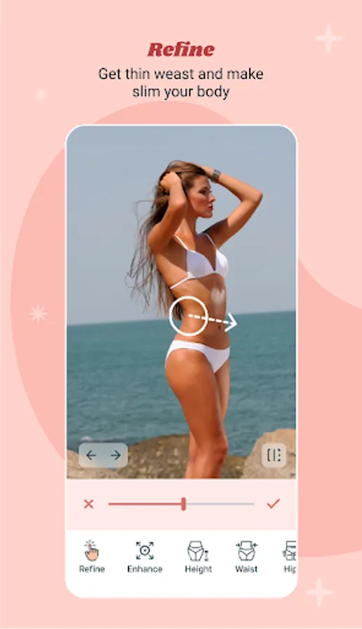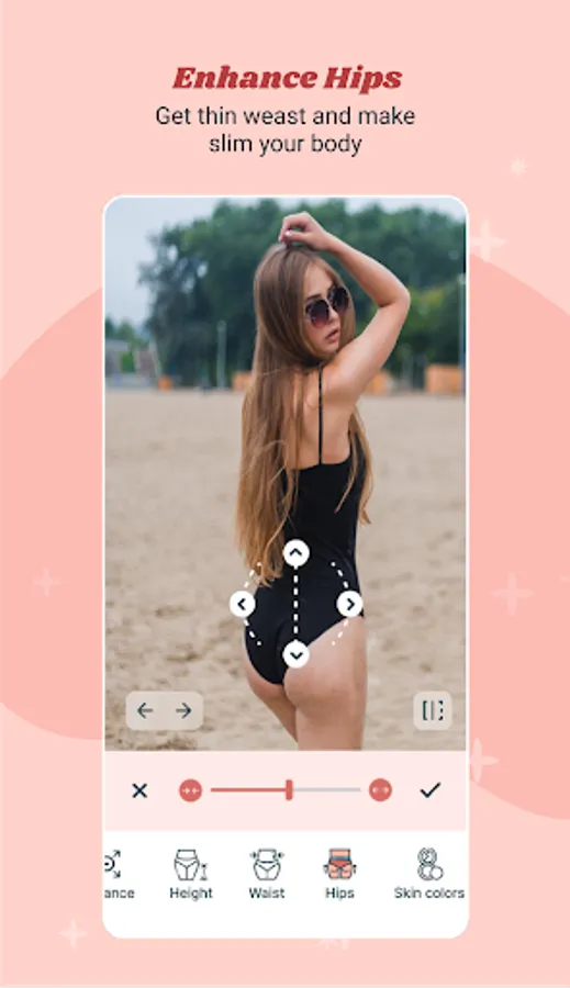 Body Shape & Beauty Editor is a fantastic photo editor. It can help you reshape body curves to get the slim body, perfect figure, thin waist, long legs, abs. and retouch your face to skinny face. This body and face enhancer perfect for self-entertainment or online showcasing.