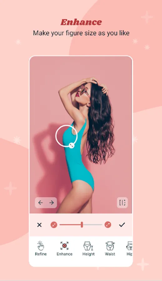 This app is a body enhancer that allows to retouch your body and get perfect figure line; This app is also a face enhancer that allows you to retouch your face so that you get a skinny and smooth face. This app is also a photo enhancer that allows you to decorate, crop and mix photos.