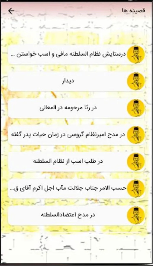 Iraj Mirza's poems can be divided into two completely different sections. The first part of pre-constitutional poetry, often praised by the Qajar authorities and the second, post-constitutional poetry that criticized the community.