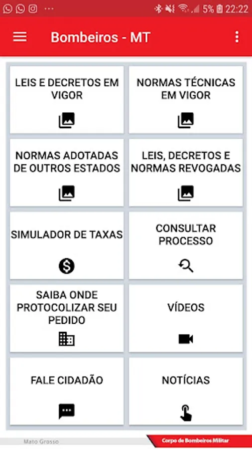 Application for the public in general. Lets see the Laws, Decrees and Regulations related to the Security Service Fire and Panic of Mato Grosso. It has a rate simulator, consultation, address and telephone number of CBMMT units and provides access to videos for guidance from the technical area of the Fire Brigade of the State of Mato Grosso.