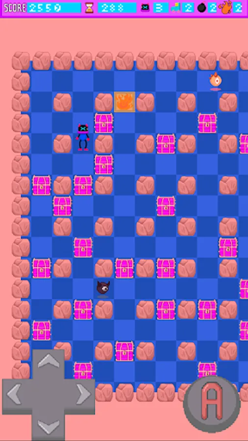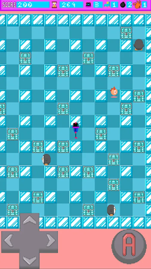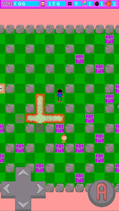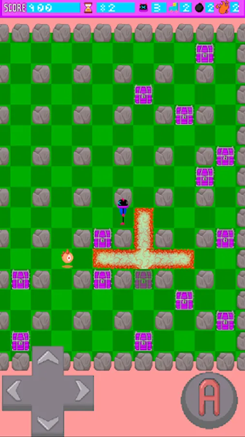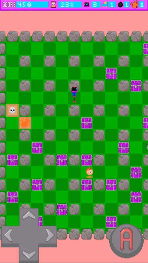 move the man through the corridors and place bombs to discover the exit door, you enter objects that will help you increase your bomber powers