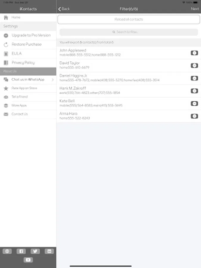 Export all unknown WhatsApp contact numbers and import mobile numbers into your mobile contacts app. iContacts app auto generate contact name and you can save the list quickly.