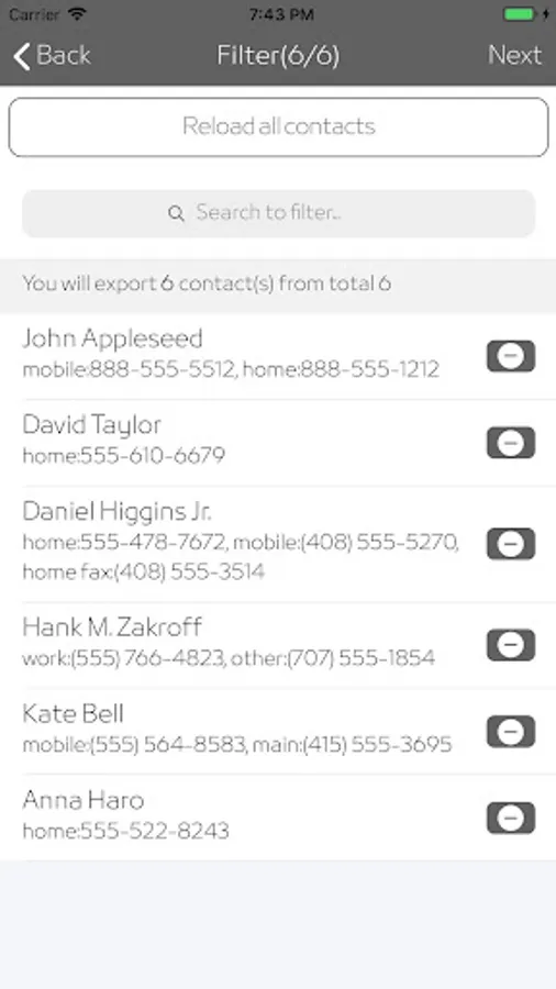 You can customize contacts list by choosing fields from Name, Phones, Emails, URLs, Address, Notes, IMS, Organizations and Birthday so that you can download only that fields. Also you can filter contacts and export. Ex: You can download contacts with contact name contains keyword. Say export all contacts that having name contains “friend” etc. You can edit or delete name or number before export.