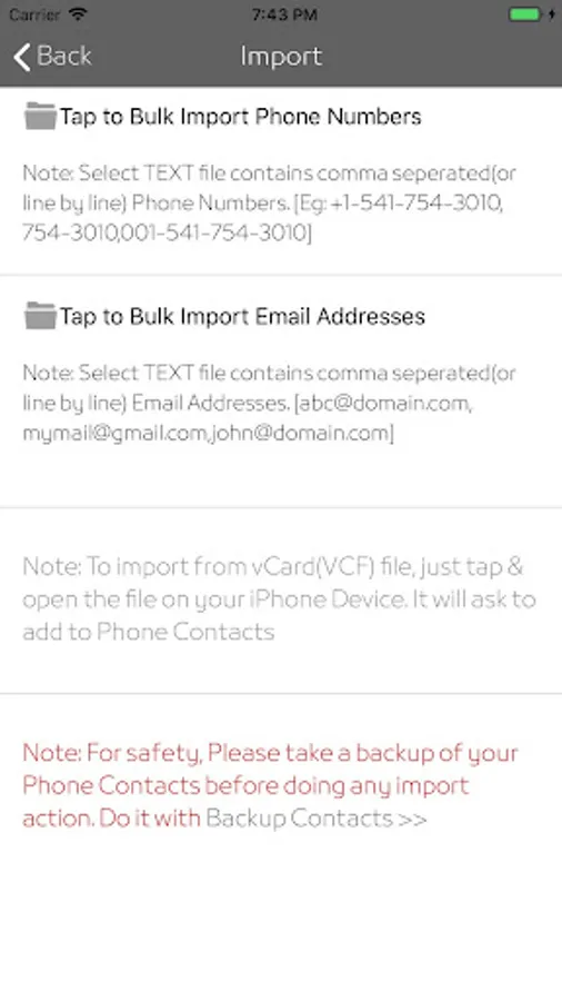- Import email addresses from txt file. iKontacts app allows you save email list easily and hence allows to bulk import emails from text file.