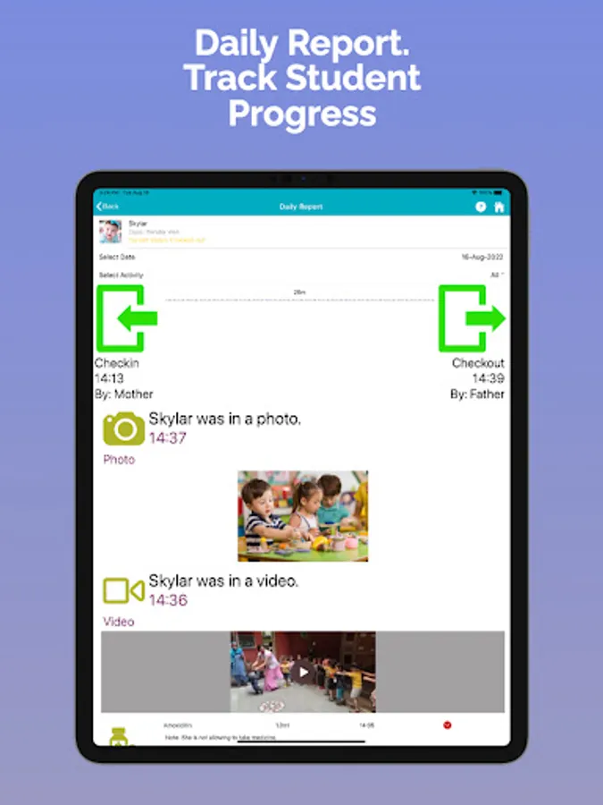 KidQ allows you to manage everything you need such as; checkin, checkout, activities, academic learning, daily report, photos, videos, calendars, attendance, messaging, and much more