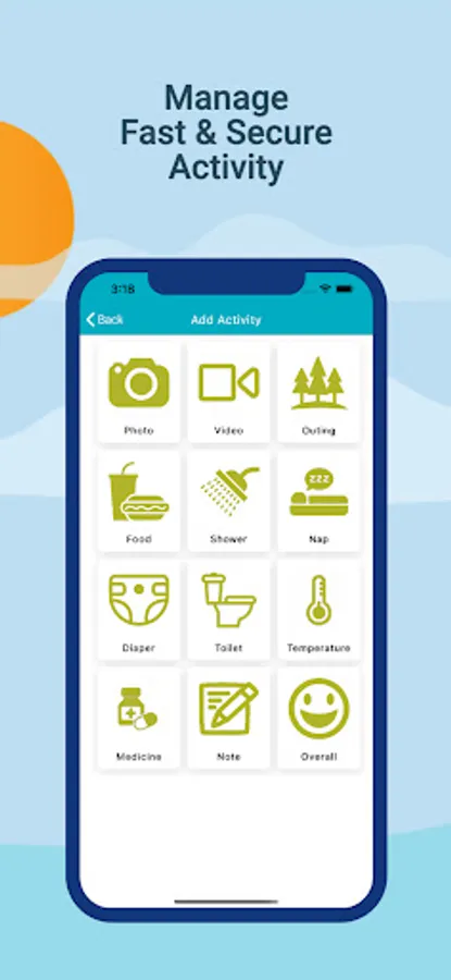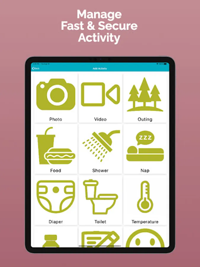 Quick entry of activities such as Photo, Video, Outing, Food, Bath, Medicine, Toilet, Temperature and more.