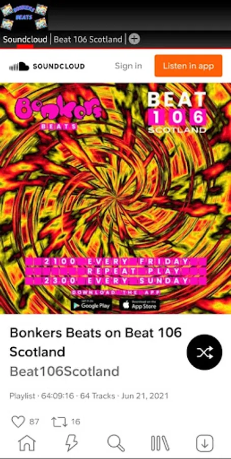 This App Makes It Faster & Easier To Listen To All Your Favourite Bonkers Beats Shows From Beat 106 Scotland On Soundcloud. You Don't Need To Sign In To Listen. You Can Lock Your Phone or minimise the app And It Will Still Play.