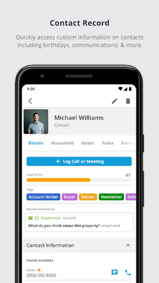 - Easily manage your contacts and leads, and quickly access important details; including contact information, connections, notes, tasks, households and more.