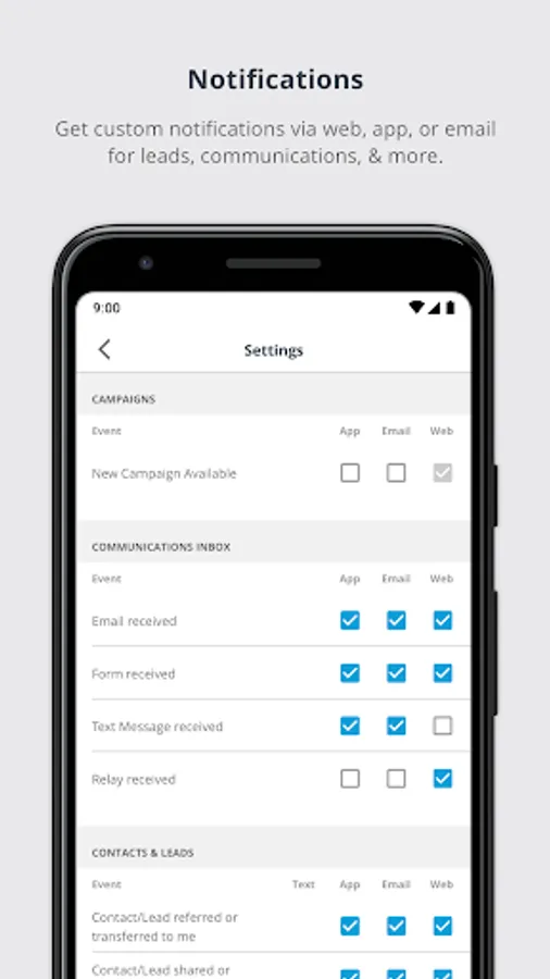 - Seamlessly receive push notifications from the desktop CRM to your mobile device for campaigns, communications, leads and contacts.