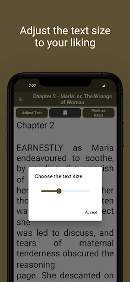 Say goodbye to eye strain with our customizable text size feature. Adjust the text to a size that suits your comfort, ensuring you can immerse yourself in the compelling narrative of 'Maria' without distraction.