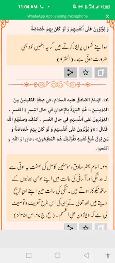 ہمیں انتہائی خوشی ہو رہی ہے کہ پہلی بار احادیث کا ایسا مستند مواد مومنین کے لئے اردو زبان میں پیش کر رہے ہیں۔ اس ایپ میں کسی بھی باب کی کسی بھی حدیث کا بلکل آسانی سے مطالعہ کر سکتے ہیں؛ ساتھ ہی تلاش کے ذریعہ اپنی مطلوبہ حدیث کو ایک کلک پر حاصل کر سکتے ہیں۔ حدیث کو عربی متن اور ترجمہ کے ساتھ شیئر بھی کرسکتے ہیں۔