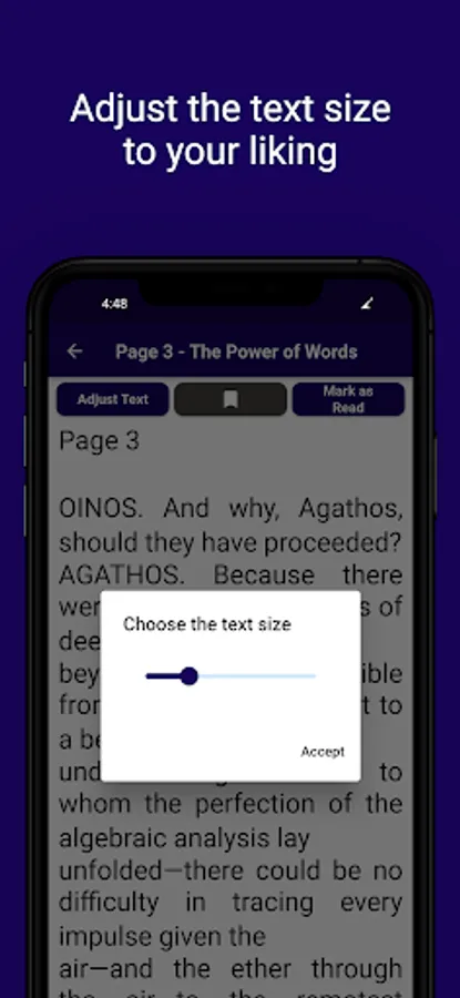 We understand that comfort is key when it comes to reading. Hence, our app offers the freedom to adjust the text size to your liking. Whether you prefer small print or large, adjust the text size for an optimal reading experience.