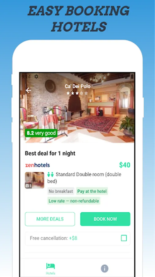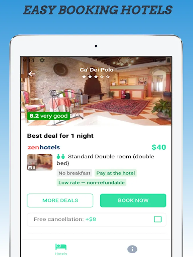 Using this incredibly amazing and free booking application, you can easily find thousands of cheap hotel deals. Find an accommodation option for your vacation, business trip or just spend a weekend anywhere in the world. You can book in advance or at the last moment. Find great hotel deals for yourself. Download the travel app and join the thousands of people who book holiday homes, hotels and motels. Manage your reservation without leaving your office, right out of the car and even when walking. All hotels online are available to you. All you need is just to download our app and start using it.