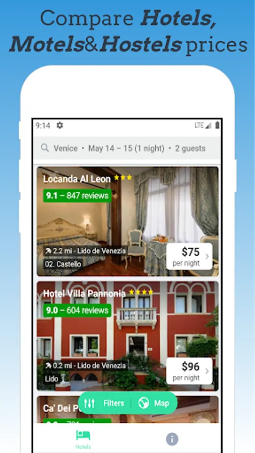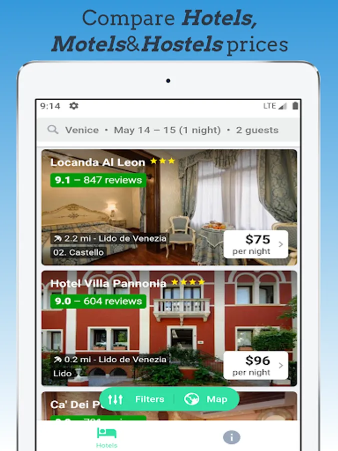 If you are planning a trip or vacation and want to find the perfect hotel for yourself at a good price, then the Hotel Booking App is by far the most profitable chips hotels booking application. Only the best hotel deals with good discounts are shown here. On the Hotel Booking App, you can find a cheap segment in the hotel industry in just one click. Also, this application is able to find located hotel booking near me. The budget application for booking a hotel provides a huge assortment of resort and luxury apartments for relaxation. You do not have to move anywhere to get the cheapest price. There is absolutely no need to pay for our cost comparison method. We compare prices with more than 130 sites. That is why every traveler saves money thanks to the Hotel Booking App You will be pleasantly surprised by our best offers. If you get lost, our function near the hotel will always help you. Everything is here to make you comfortable. This application is the best assistant in finding the best Hotel reservation around the world. The Hotel Booking App is not only created to help you find a motel, hotel or B & B, but also easily compares the cost on the most famous resources for booking hotels any type of accommodation: Tripadvisor, Priceline, Expedia, ZenHotels, Hotels com, Booking com, Agoda, Trip com, Amoma com, Booking com, Associated Hotels, Trivago, HotelTonight, Hotellook, LateRooms, Travelrepublic, and more.