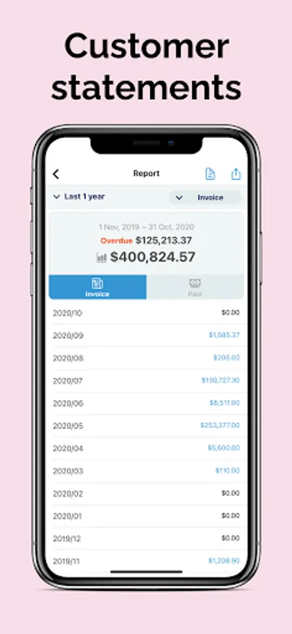 PDF reports can be generated for invoices, estimates and payment summaries. These can be organised by month, customer or item for convenient accounting and bookkeeping.
