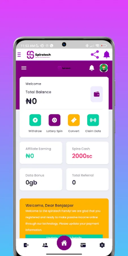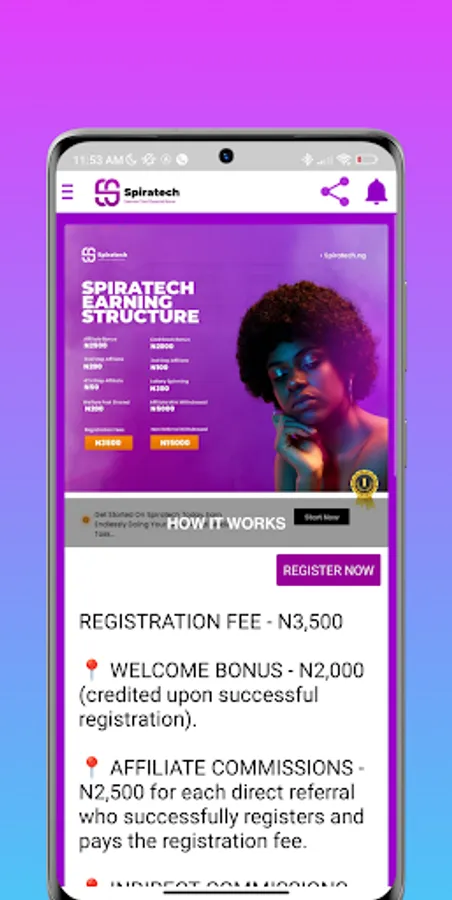 The first step to start earning with Spiratech is by registering on the platform with a one-time registration fee of N3,500. Upon registration, users will receive a welcome bonus of N2,000. This bonus serves as an initial boost to the user's earning potential.