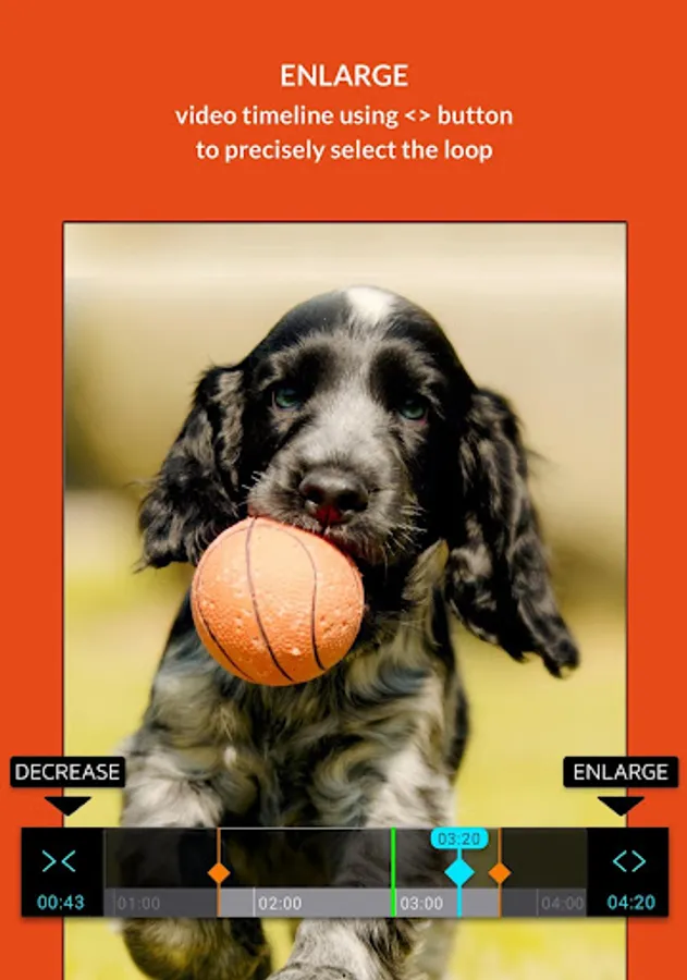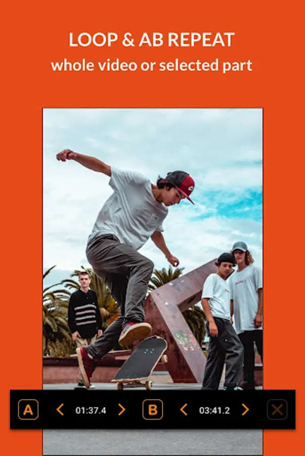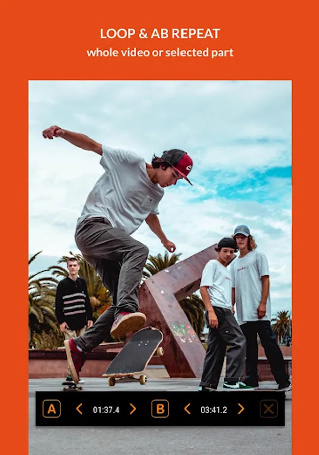 When you open a video or audio file, the A point is set at the start, and the B is set at the end. You can see them on the timeline as orange vertical lines with diamonds. The video or audio will play from A to B point. To set new border points for the loop, swipe the controllers' position on the timeline or use the buttons from the menu. Arrows will help you define the loop precisely.