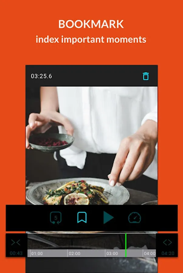 BOOKMARK: Watching an educational video with no time to take notes? Add bookmarks and index the most important content. Use bookmarks to set AB points for your video loop. Make the best of learning!