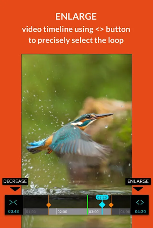 Enlarge the Video Timeline using the Expand Button "<>" on the right. Now you can precisely select the loop points or bookmark position. To zoom out the timeline, use the Decrease button "><" on the left.