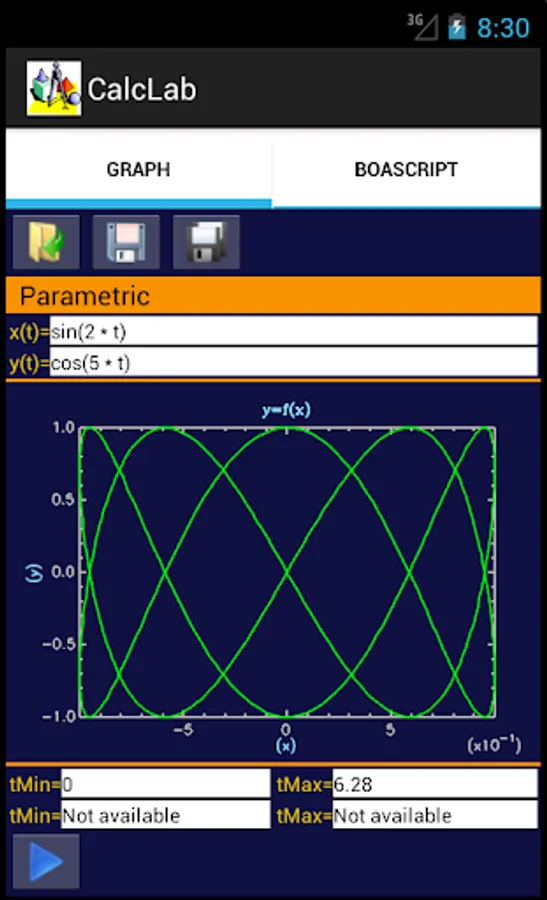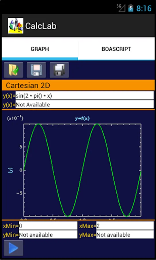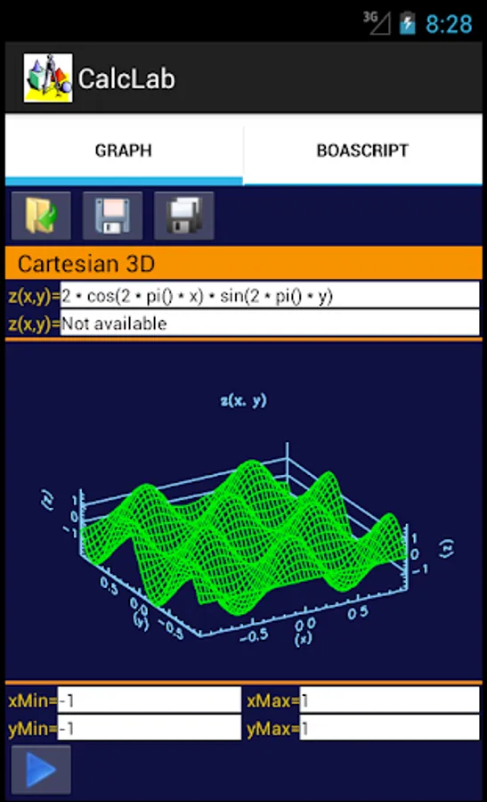 CalcLab is a graphing calculator (also graphics / graphic calculator) refers to a class of scientific calculators that are capable of plotting graphs (Cartesian two and three dimensional, Polar and Parametric) and performing calculations using BoaScript scripting language. BoaScript has a C-style syntax and allows to conduct the calculations in the wide range - from arithmetic and trigonometric calculations to complex numerical solutions.