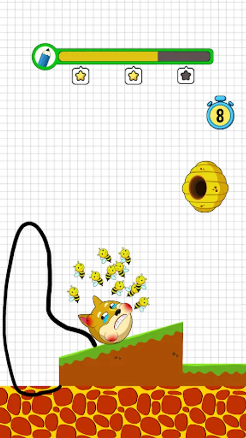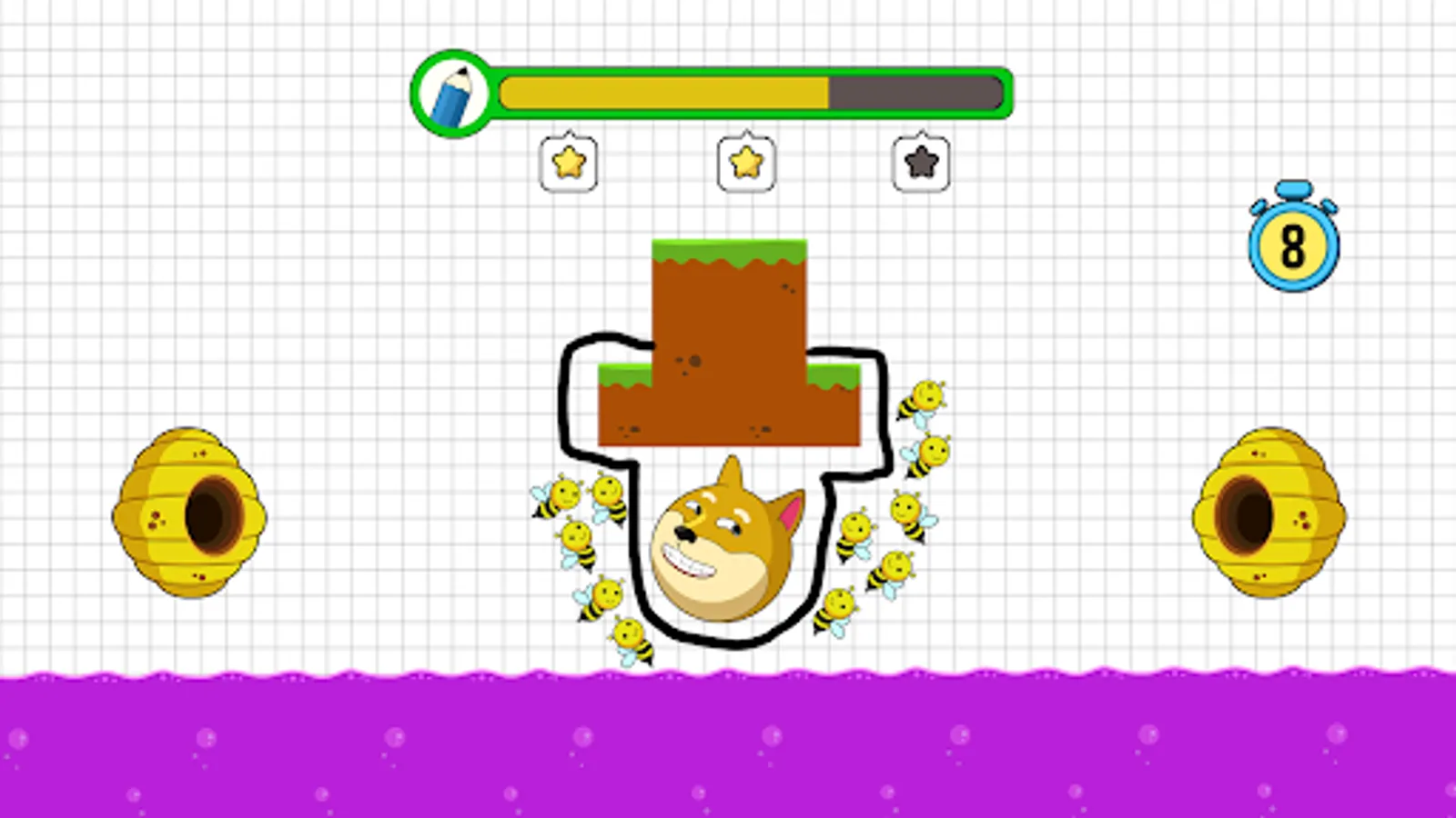You can go on to the following level after saving the dog. The less ink you use, the higher rate you get. If you fail, please try to draw again to save the dog from bees. Try to win as many levels as you can this entertaining & simple game to sharpen your brain! Also, share with your friends and play save the dog bee together!